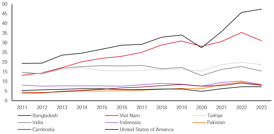 Top 9 apparel exporters globally after China (USDbn)