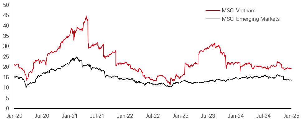 While Vietnamese equities command a higher valuation than broader frontier markets - with a PE ratio of 16x for MSCI Vietnam compared to 11x for MSCI Frontier Markets - it is only slightly higher than the 15x for emerging markets, and reflects investor confidence in its long-term growth prospects. Given superior earnings growth potential and structural tailwinds, these valuations remain justified in our view.