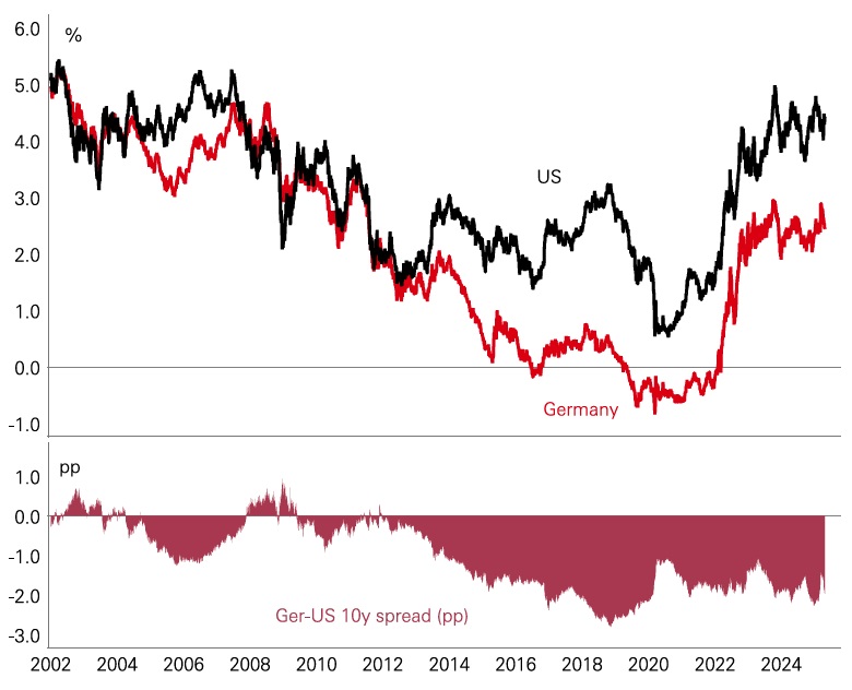 Accordingly, the post-Global Financial Crisis persistently wide 10-year spread between US and German bond could narrow. Alternatively, increased concern over US fiscal sustainability could drag global yields higher. However, much is contingent on factors such as the effective implementation of the German fiscal package and the broader economic response, including potential crowding-in effects on private sector investment. The implications for the eurozone's fiscal sustainability and the ability of other member states to manage rising borrowing costs will be critical to monitor as these developments unfold.