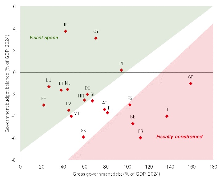 The fiscal space available to other eurozone countries is more limited. Approximately 50 per cent of eurozone countries fall into the fiscally constrained category, including Italy and France, with government debt-to-GDP ratios exceeding 100 per cent. These countries face larger challenges in increasing defence spending and stimulating growth relative to Germany.