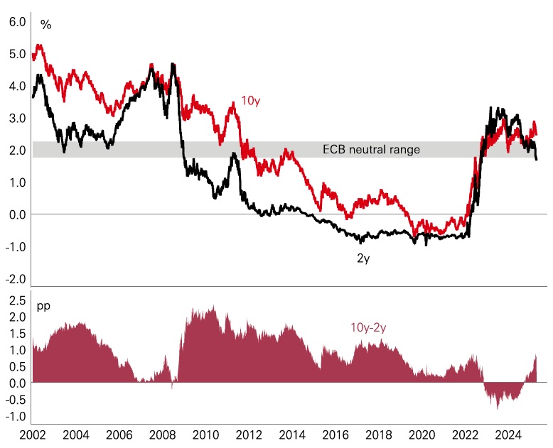 The recent fiscal package announced by Germany has raised questions about the outlook for European bond yields. In particular, the possibility of 10-year bund yields moving above 3 per cent on a sustained basis. The European Central Bank (ECB) has indicated that the neutral range for policy rates is around 1.75 per cent to 2.25 per cent, with the two-year German bund currently sitting just below this range. Historically, the German yield curve has exhibited a steepness of 100 basis points or more over sustained periods. With the German government increasing its bond issuance to finance the stimulus, market expectations for higher growth and inflation are likely to push up longer dated yields over the medium term, making 3 per cent-plus 10-year bund yields possible once headwinds from current trade tensions ease.